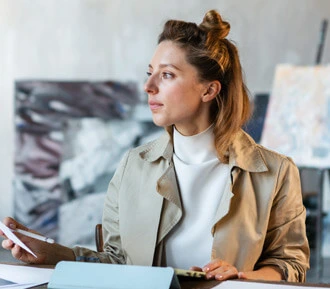 Smiling graphic designer browsing images on desktop computer in creative office space
